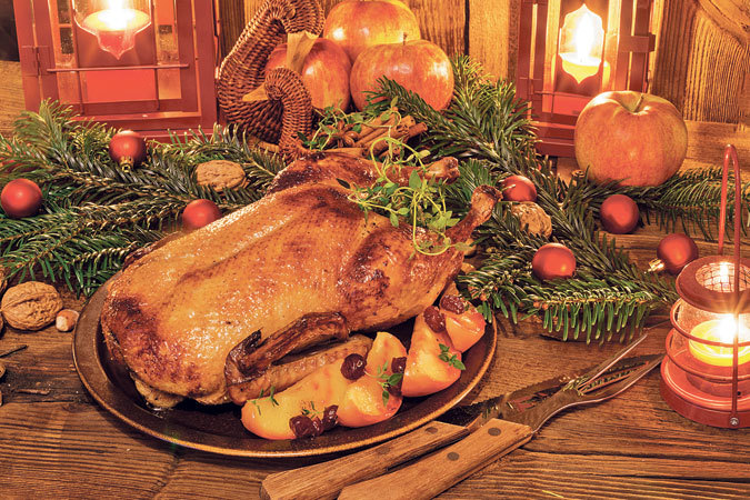 Гусь с яблоками, черносливом и орехами